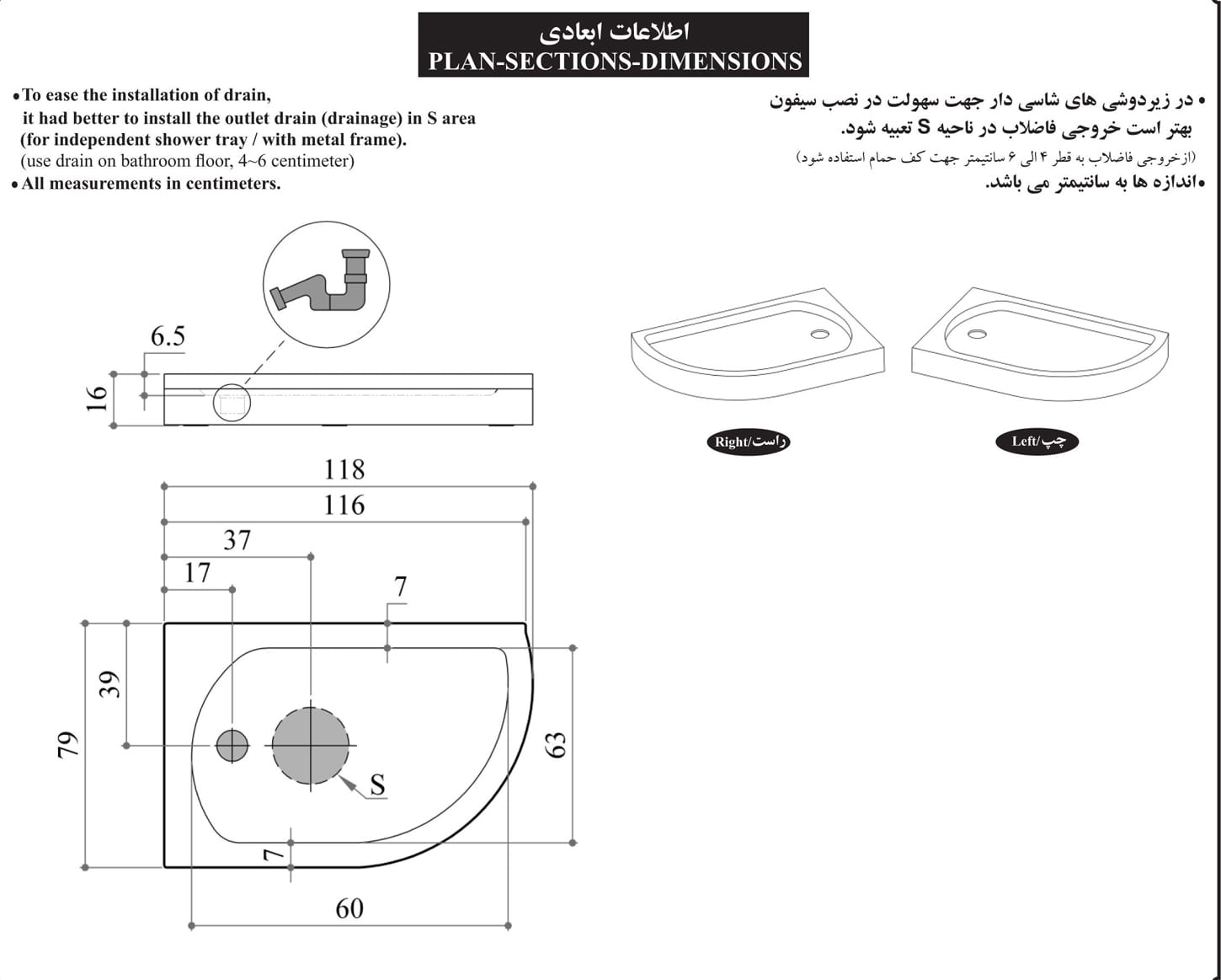 | مکان حدودی خروجی فاضلاب: 37 در 39 سانتیمتر | جنس ورق: ABS-Acrylic | جنس شاسی: آهن گالوانیزه |